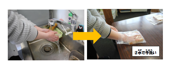 ①のあと、水だけで手洗いをしました。子どもたちの中にも、トイレのあとや外遊びのあと、水だけで手洗いをすませている子を見かけます。水だけでバイキンがおちるのか見ものですね。