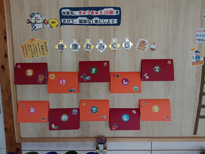 1月の掲示物では、健康おみくじを掲示していました。毎日いろんな子どもたちがおみくじを引いては、一喜一憂する姿がとても可愛らしかったです。