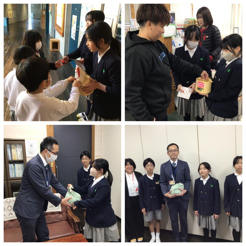 12月15日~19日まで5日間、鹿北小学校児童会で「赤い羽根共同募金」を行いました。鹿北委員会の呼びかけで、たくさんの募金が集まりました。事前に、今年も社会福祉協議会の木庭さんに、赤い羽根共同募金の始まりや集まったお金の使い方などの説明をしていただきました。鹿北委員会の児童が、5日間児童昇降口の廊下で募金活動に立ち、最終日には職員室にも呼びかけに来てくれました。鹿北委員会で、毎日昼休みに募金額の集計をして、12月24日に社会福祉協議会の木庭さんにお渡しすることができました。今年もたくさんのご協力ありがとうございました。
