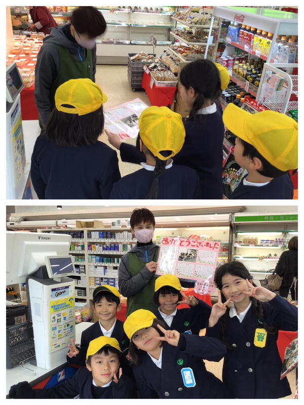 2学期に、2年生は生活科の学習で、地域にある施設やお店に行って、いろんなお話を聞かせていただいたり、見学をさせていただいたりしました。2年生からお礼のメッセージを書き、終業式の日にグループごとに、お礼のメッセージを渡しにいきました。写真はのなかストアさんにお渡しにいったグループです。喜んでうけとってくださって、少し緊張していた2年生も、にっこにこになりました。後日買い物に行くと、レジの近くに掲示してありました。地域の皆様、本当にありがとうございました。今後とも、子どもたちを見守っていただきますようお願いいたします。