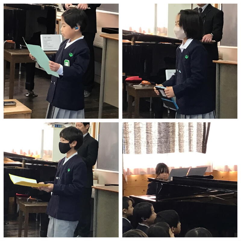 12月は人権について考える「人権旬間」を設定し、全ての学年で「人権学習」を行いました。そして12月11日に「人権集会」を行いました。各学年の人権宣言や学びの振り返りなどの発表を行った後に、先生たちによる「わたしのいもうと」の劇を動画で鑑賞し、間違っていることやおかしいと思うことなどを出し合いました。そして、どのようにすることが大切なのかについて考えました。次々と手を挙げて発表してくれる子どもたち。いじめられている人を見て、見ぬふりしている事のおかしさにも気づき、先生や家族、誰にでもいいから、そのことを伝えて、いじめをなくすために行動する仲間になることをみんなで確認しました。