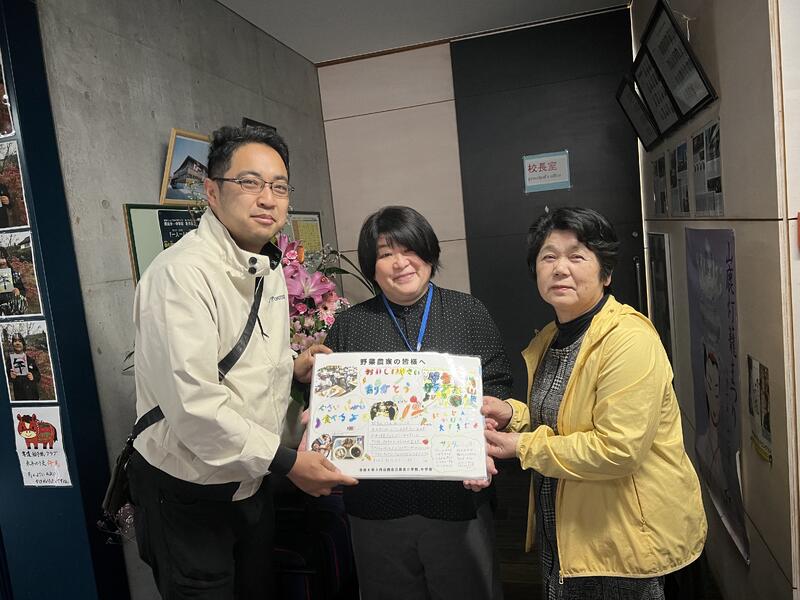 元田工務店様を通じてたくさんの野菜やお米、馬肉、のりと食材を提供していただきました。また、山鹿の米を作られている組合からもお米をいただきました。感謝の気持ちでいっぱいです。その感謝の気持ちを込めたメッセージに写真やイラストを添えたお礼状をお渡ししました。とても喜んでいただきました。