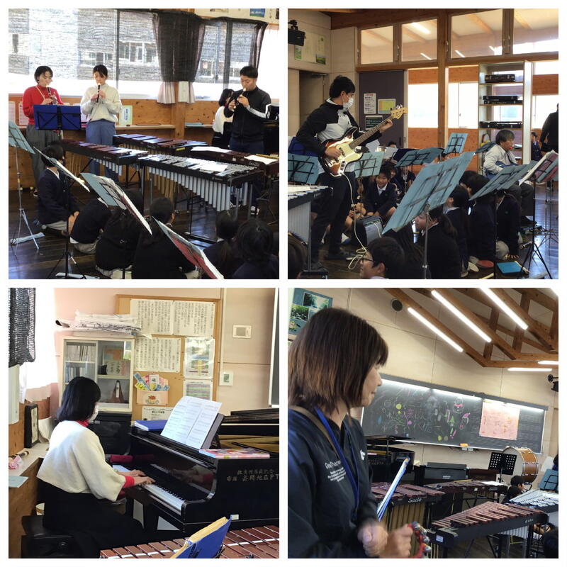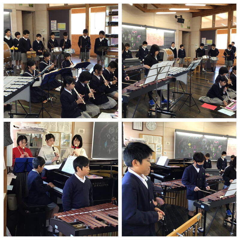 1学期にはミニミニコンサートを開いてくれた5年生が、2学期末にクリスマスコンサートを開いてくれました。なんと、中学校の音楽部とのコラボもありました。招待状をつくって、小学校、中学校の先生方に配って宣伝しました!まずは先生たちの演奏です。小学校・中学校の先生方が一緒に演奏されました!(さすが!小中連携♡鹿北小中)その後は音楽部の中学生も一緒に合奏を披露。音楽室は満員御礼の大賑わいです。もちつきのために来校された5年生の保護者の皆さん、小学生、中学生、小中学校の先生たちがたくさん聴きに来てくれました。最後には「アンコール」の声もかかり、大盛況のクリスマスコンサートとなりました。