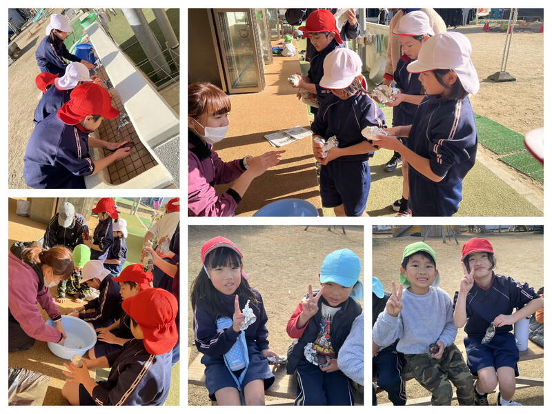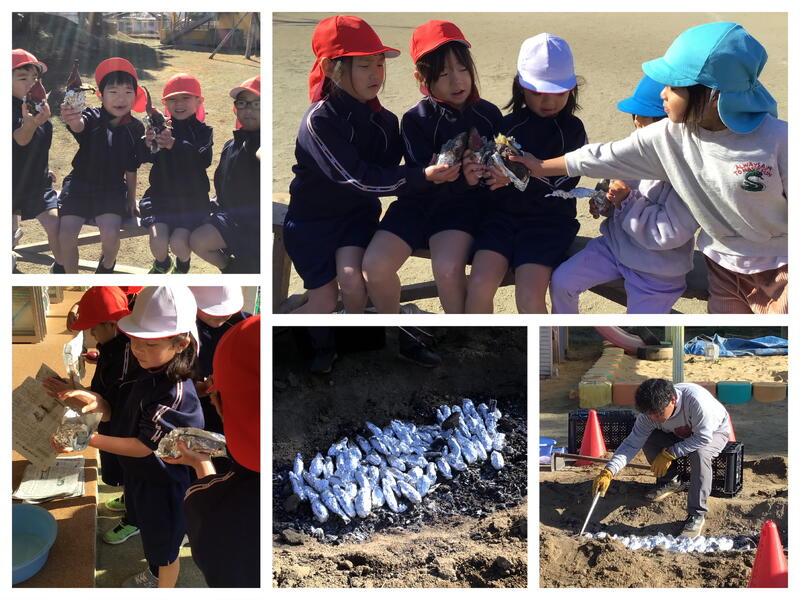 12月10日は1年生、12日は2年生が、まほろば保育園からお招きをいただき、焼き芋を楽しみました。まほろば保育園のみんなと鹿北小の1・2年生で植えたサツマイモです。芋ほりの様子もホームページにアップしていますが、今年もとても大きくておいしいお芋ができていました。保育園の園庭で炭火をつかって焼き上げてある焼き芋は、黄金に輝いていて最高でした。(私もごちそうになりました。)子どもたちの笑顔がとっても素敵で、久しぶりに訪れた保育園は卒園生にとっては懐かしく、初めて訪れる子たちにとっては、楽しい素敵な園庭に目を輝かせていました。