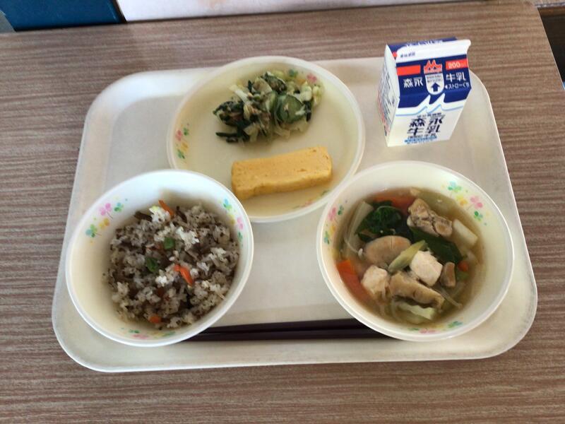 今日は筍ご飯です。筍とは、竹の若い芽のことです。地面からぐんぐん伸びる力が強く、1日に、1メートル近く伸びることがあります。食物繊維が多くおなかの調子を整えてくれるだけでなく、シャキシャキとした食感が特徴的な食材です。のっぺい汁もおいしかったです。ししゃもフライもおいしかったです。