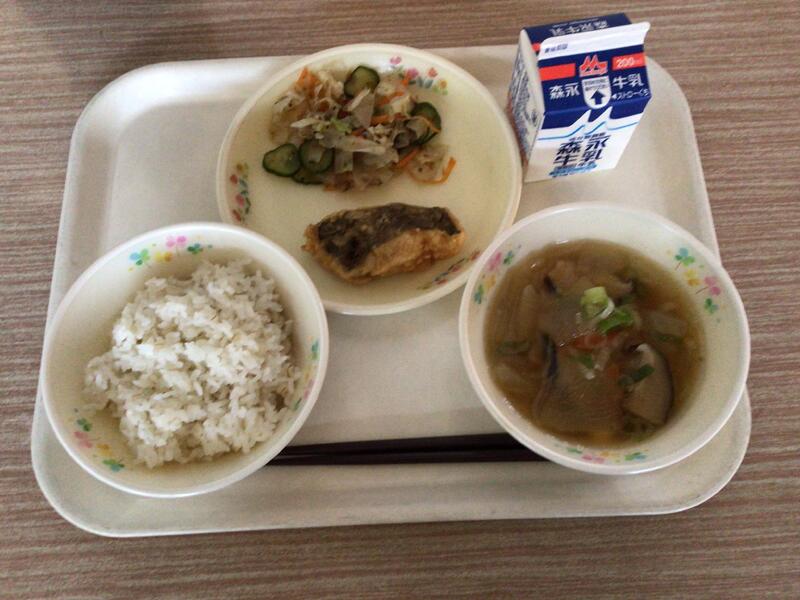 牛乳、麦ご飯、鳥ゴボウ汁、魚の佐々礼焼き、壺漬け和え