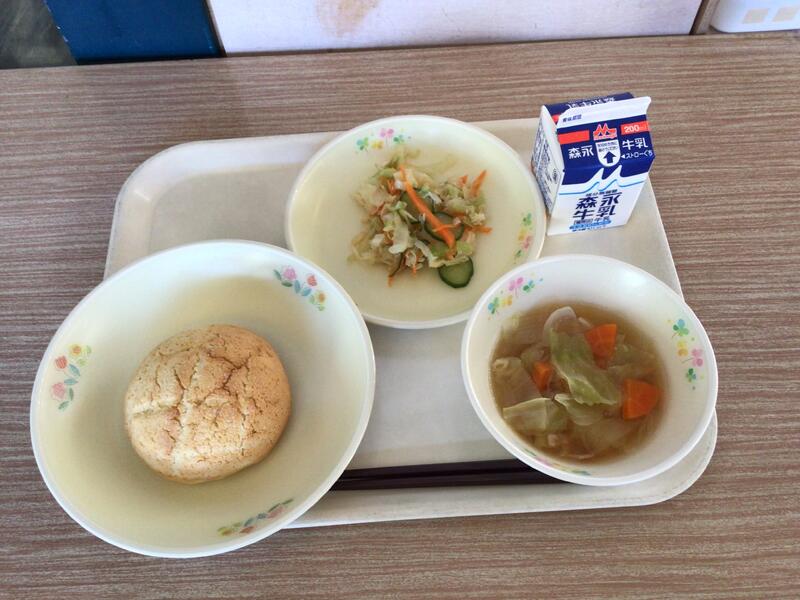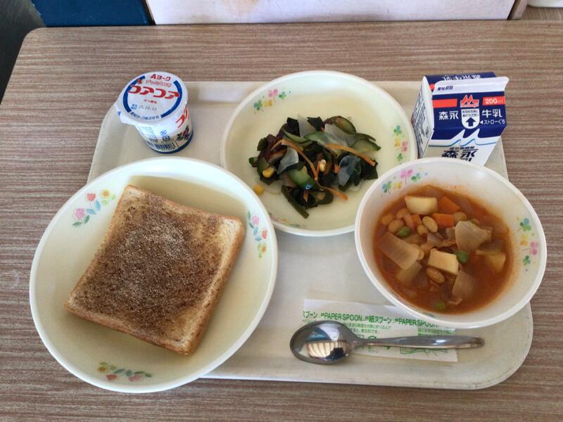 キャラメル風味のシュガーパンにヨーグルト。子どもたちのテンションが上がっていました。豚肉や豆がたくさん入ったポークビーンズも、海藻サラダも、栄養たっぷりで、おいしい給食でした。