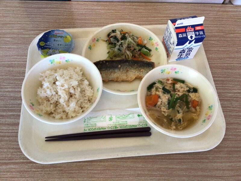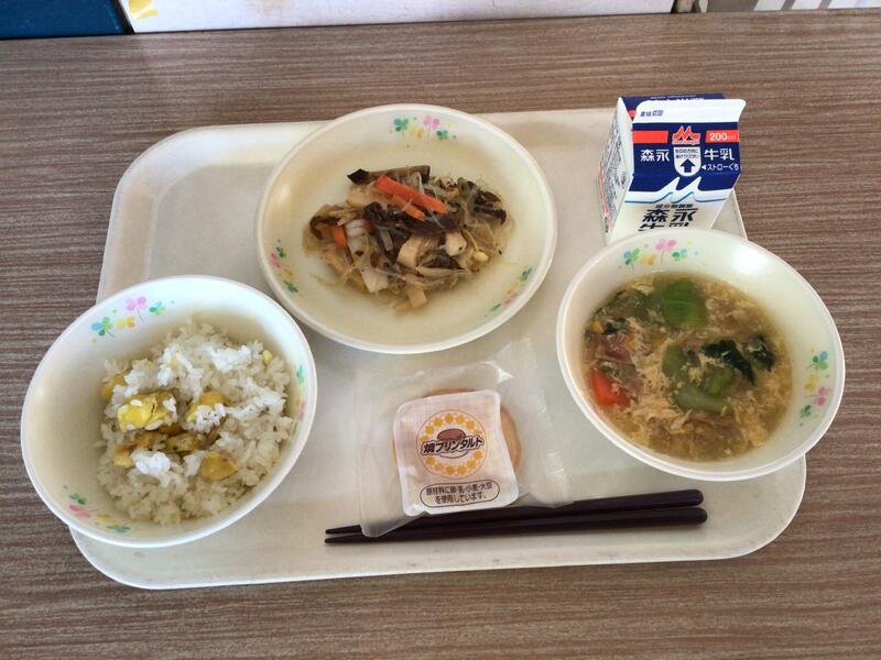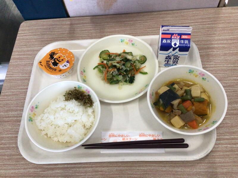 今日は鰯の蒲焼きです。開いた鰯に衣をつけてあげ、タレに漬けてあります。とても食べやすく、特に蒲焼きのたれが子どもたちには人気です。今夜は月がきれいな中秋の名月です。なし味のおつきみゼリーもついてます。収穫や豊作への感謝をしていただきました。今夜はお月様が見えるといいですね。