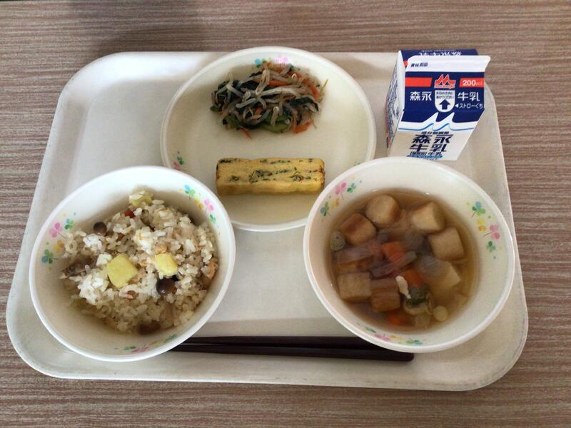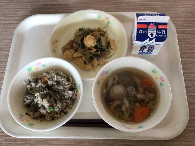 牛乳、秋の香りご飯、すまし汁、小松菜のおかか和え、千草焼き