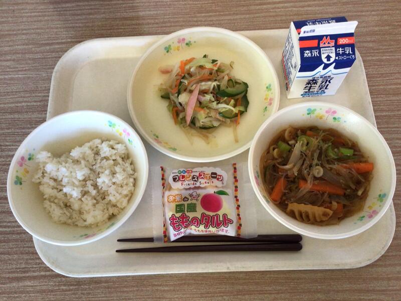 牛乳、麦ご飯、マーボー春雨、中華和え、もものタルト