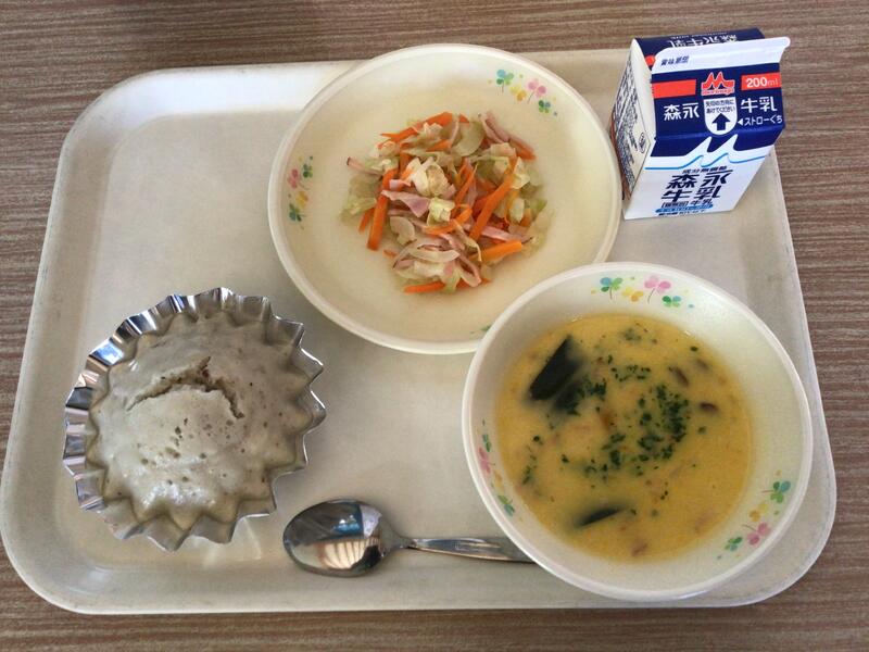 牛乳、米粉入りカボチャパン、ミネストローネ、鮭のグラタン、ももゼリー