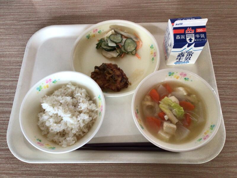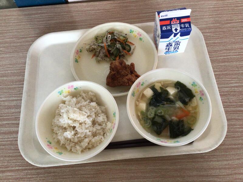 牛乳、麦ご飯、えのきと若布の味噌汁、鶏の唐揚げ、ゆかり和え