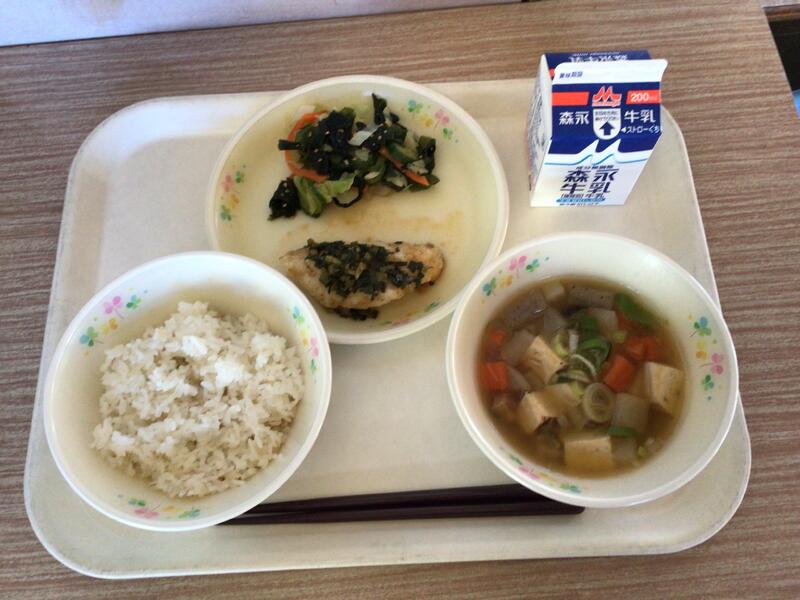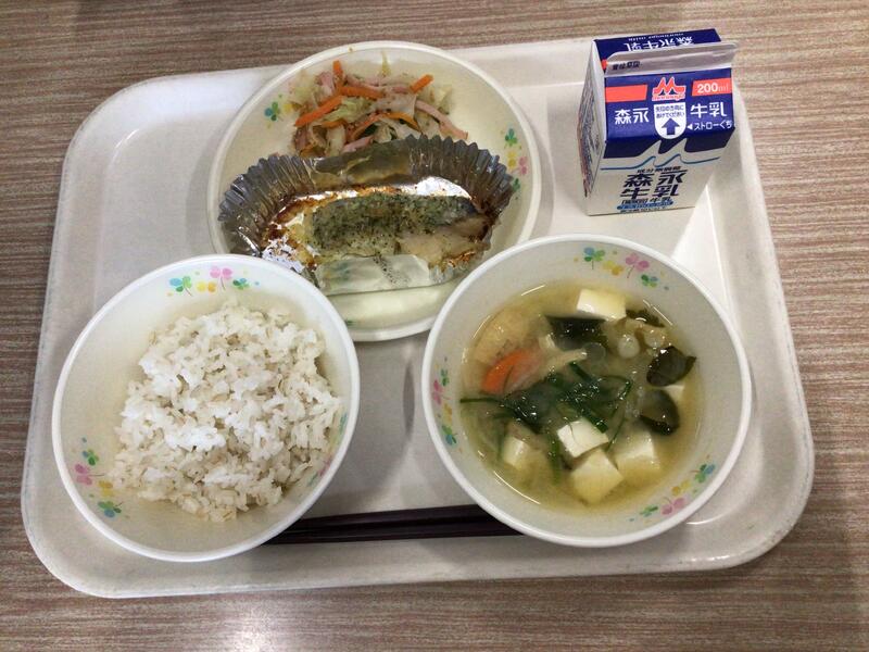 牛乳、麦ご飯、豆腐の味噌汁、魚の香草焼き、キャベツのごま和え