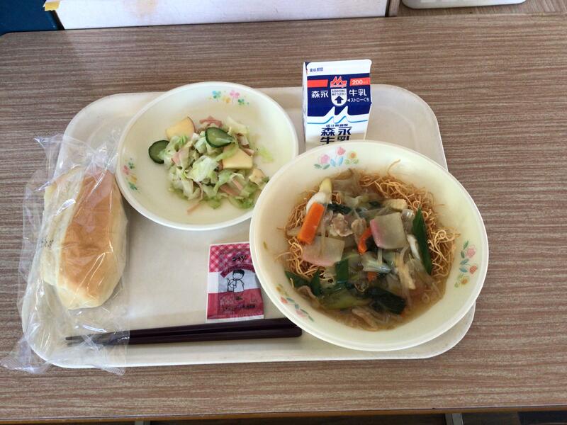 野菜たっぷりの餡(あん)をかけて麺となじませて食べます。フランスパンもあっておなかいっぱいになった子どもたちです。
