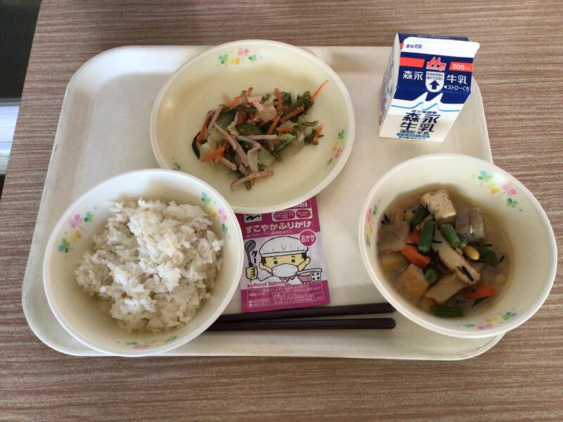 牛乳、麦ご飯、がんもと野菜のうま煮、春雨の酢の物、手作りふりかけ