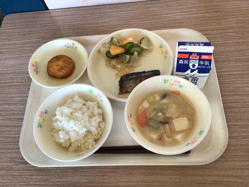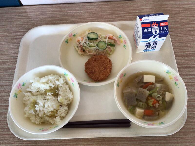今日は、山鹿の郷土料理、からいもご飯です。からいもは大津町が有名ですが、鹿本地方でもたくさんとれます。エネルギーになるデンプンを多く含み、食物繊維も多いので、おなかの調子を整えてくれる働きもあります。ちょっとだけ涼しくなった今日は、温かい豚汁もうれしかったです。
