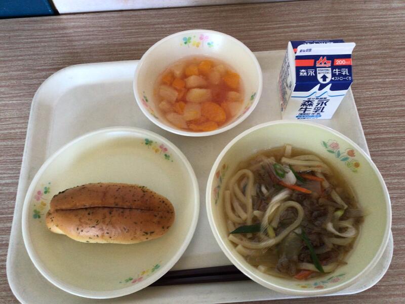 今日はフルーツが入ったアセロラジュレです。アセロラは、「ビタミンCの王様」といわれています、レモンの約34倍のビタミンCを含んでいます。免疫力向上や疲労回復に役立ちます。季節の変わり目で体調を崩しやすいですが、バランスよく栄養をとって、健康に過ごしましょう。気温が低い今日は、あたたかな肉うどんもおいしかったです。