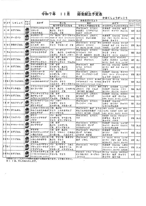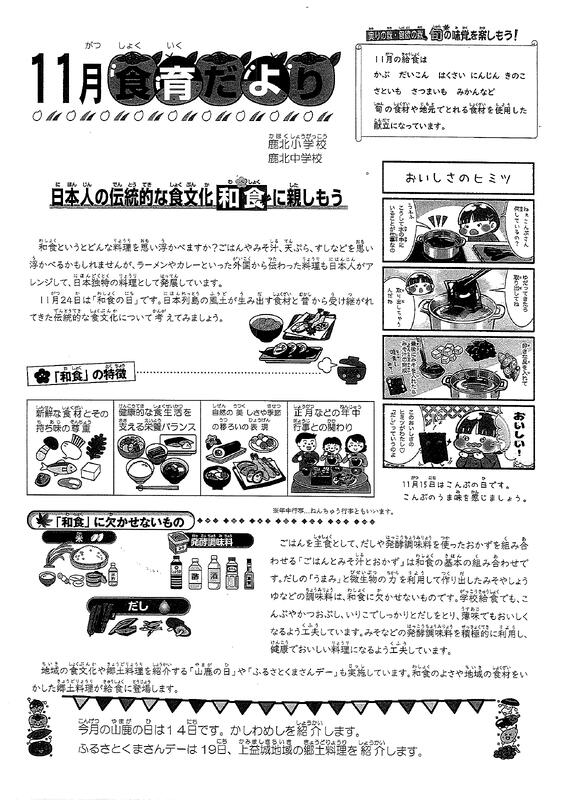急に秋がやってきたという感じの今日この頃です。気温の変化が大きく、衣服の調節での体温管理も難しいですね。さて、11月の食育だよりと献立表を掲載します。ぜひご家庭でのお料理にも役立つ情報がたくさんです。ぜひご覧ください。