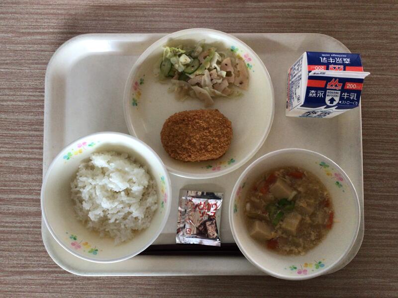 牛乳、ご飯、高野豆腐の卵とじ、コロッケ、ごまみそあえ