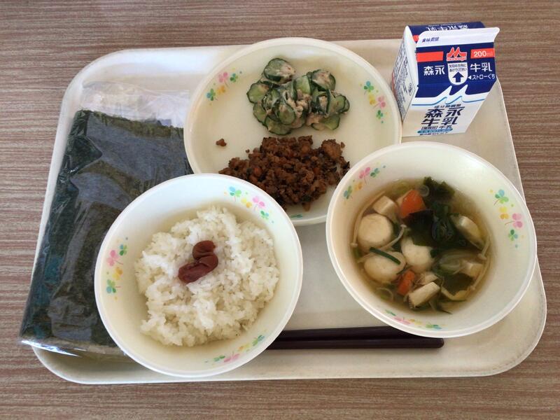 牛乳、手巻きご飯、はんぺん汁、肉味噌、のり、梅干し、ツナとキュウリの和え物