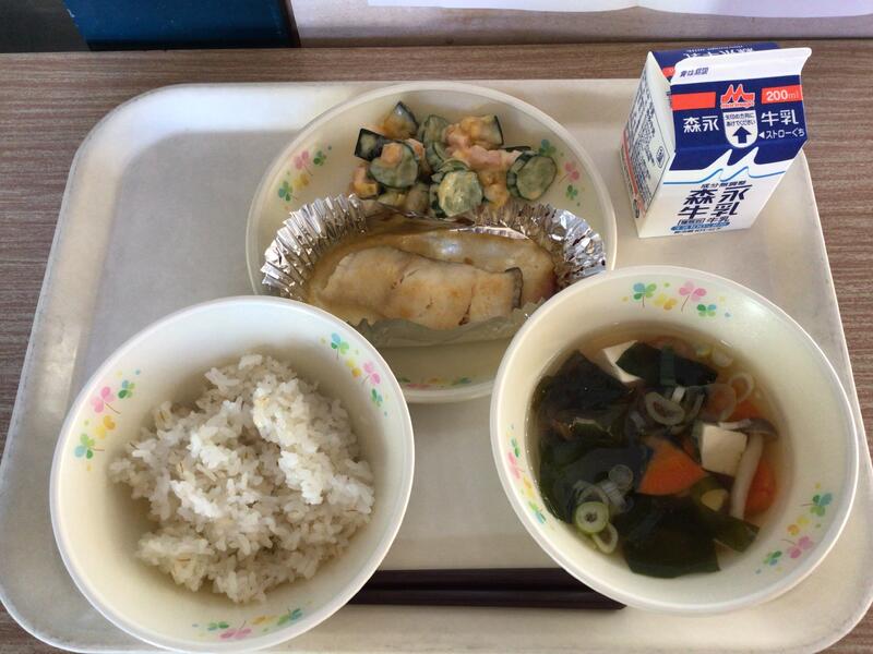 牛乳、麦ご飯、豆腐の味噌汁、ホキの銀河焼き、大根サラダ