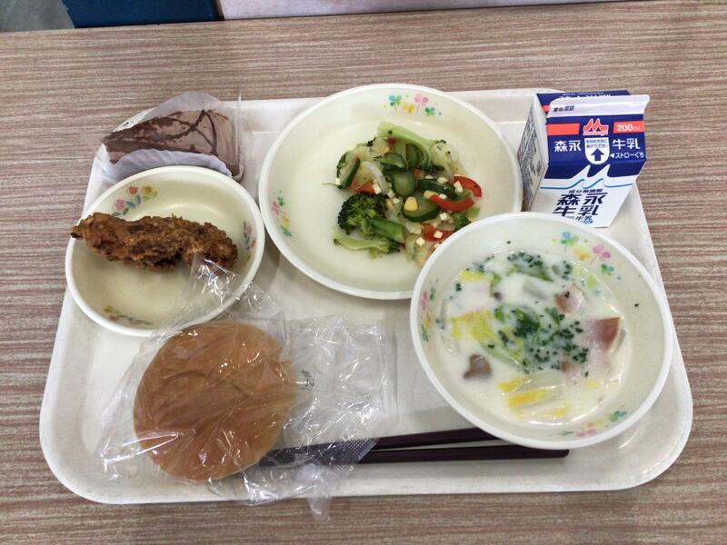 牛乳、丸パン、白菜のクリームスープ、唐揚げ、もみのきサラダ、セレクトケーキ