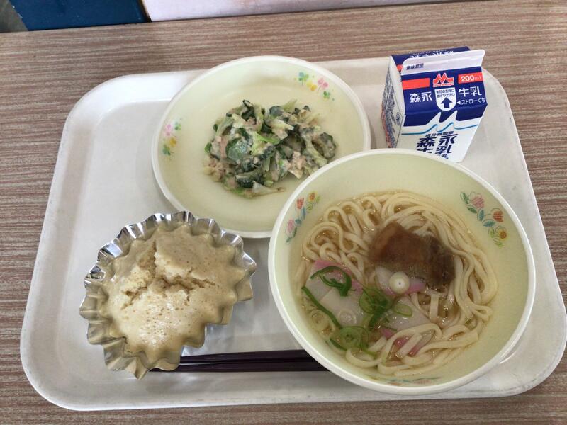 牛乳、黒糖蒸しパン、沖縄ソーキそば風、ゴーヤサラダ