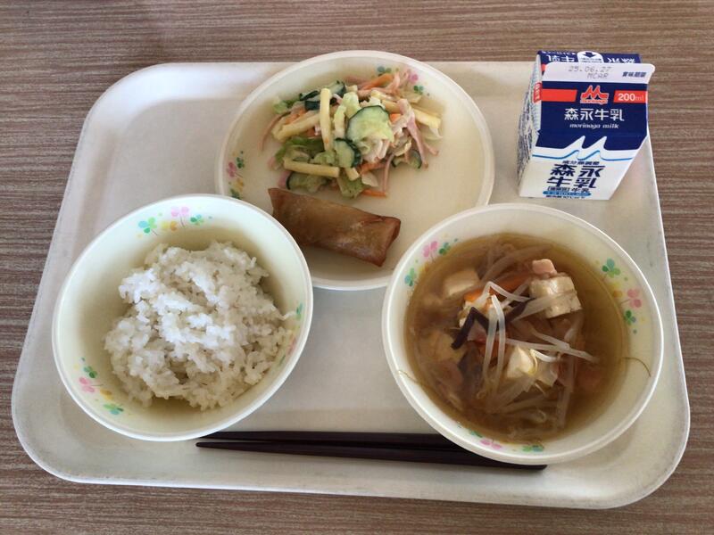 今日は春巻きです。かむと「ぱりぱり」、「ざくざく」、「カリカリ」など、食べるときにする音を「そしゃく音」といいます。春巻きはどんな音ですか。そしゃく音に注目してみると食事がもっとおいしく楽しくなります。皆さんも意識して食べてみてください。春巻きは、パリッと揚げたての時に食べる音と、しばらくおいてから食べる音で違いますよね。今日の春巻きは、パリパリととてもおいしかったです。