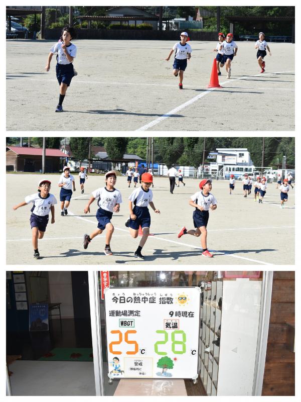 熱中症予防のため養護教諭が不快指数を測定する機械で毎日定期的に測定し、職員玄関前に掲示しています。ランランタイムに限らず、一定基準を超えた場合は、外の活動を中止するよう配慮しているところです。