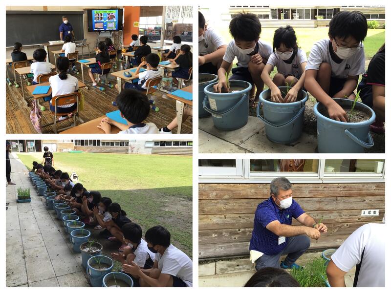 22日(火)、県立装飾古墳館の牛島学芸員を講師にお招きし、古代米の赤米と黒米の田植え(バケツに)を行いました。