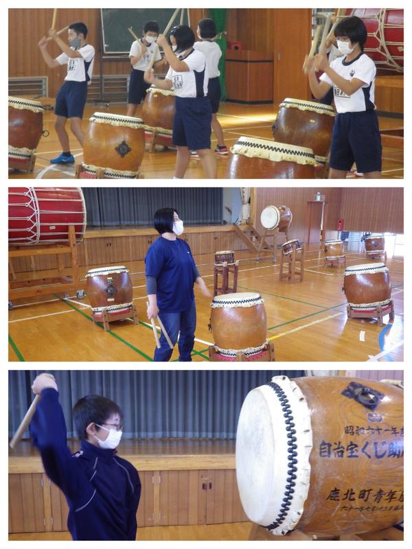 鹿北小6年生伝統の鹿北太鼓がスタートしました。楽しみにしていた児童も多く、意欲満々で取り組んでいます。健介くんのお母さんの中満育代さんにご指導いただきながら、太鼓の叩き方や基本的なリズムなど、楽しく学ぶことができています。
