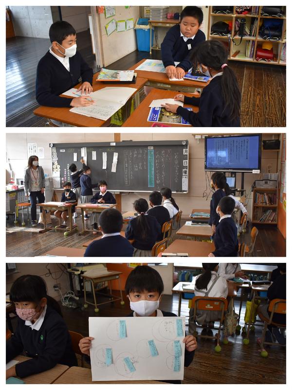 4年生は理科。人間の体のつくりを学んだあと、他の動物は人間と違いがあるかについて調べ、発表し合っていました。動物の特徴を捉え、面白い発想による発表が行われていました。