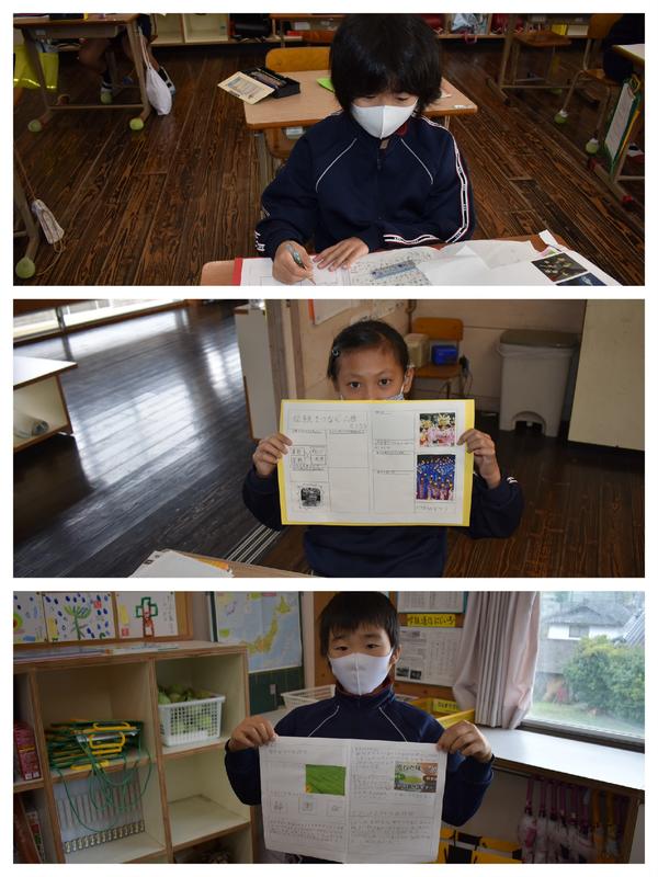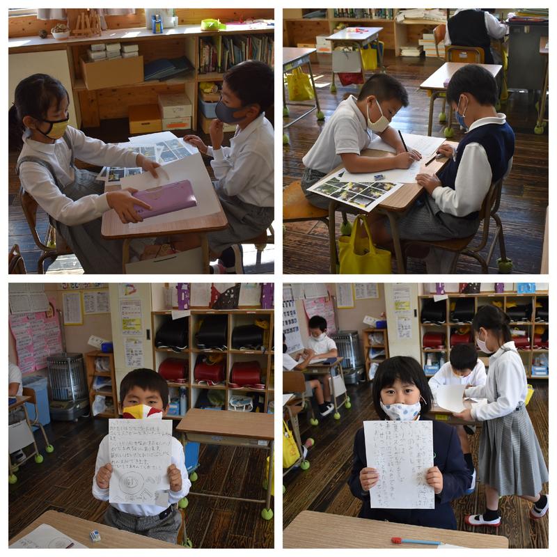3年生は国語。一つの食材から、どんな食べ物ができるかを説明するパンフレットを作りました。そのパンフレットを友だちと読みあい、工夫している点などを伝え合う内容でした。とても工夫された楽しいパンフレットができ上っていました。