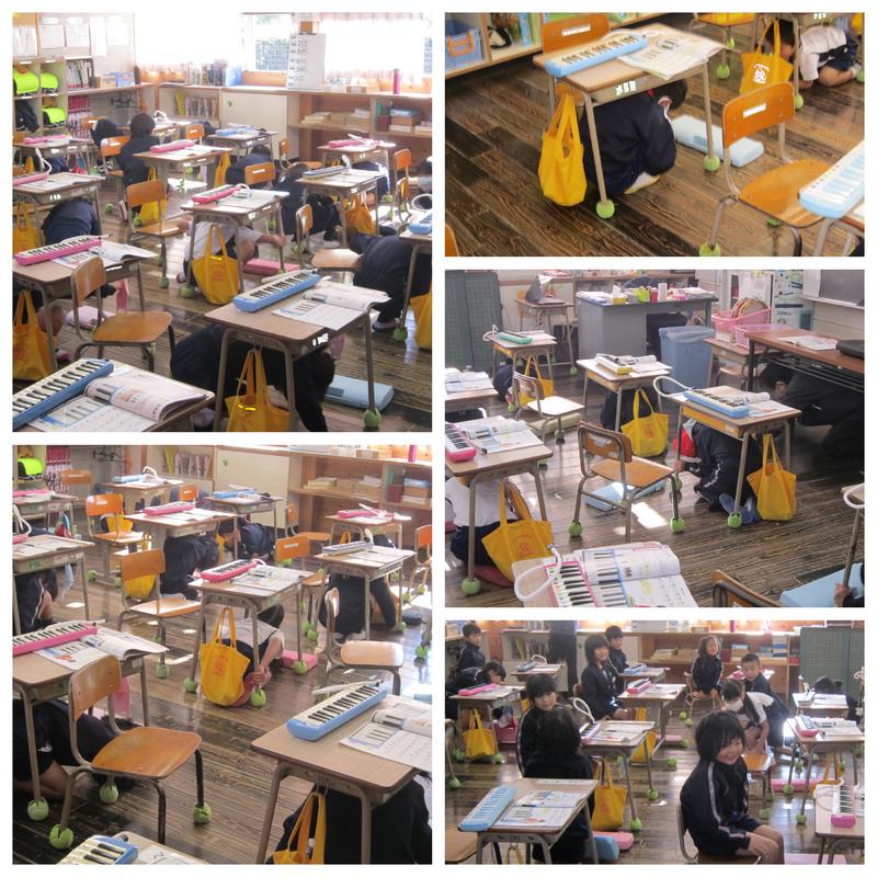 午前10時、山鹿市防災無線放送を受け、「姿勢を低くする、しゃがむ」 ⇒ 「頭や身体を守る」 ⇒ 「揺れがおさまるまで動かず待つ」を実践しました。1分間ほどの訓練でしたが、終わった後にほっとした表情を見せる子どもたちでした。