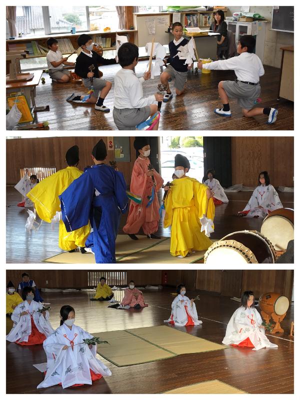 学習の成果を披露する機会として、11月23日に、芋生神社、岩野神社で行われる神楽奉納を行います。その練習も頑張っています。