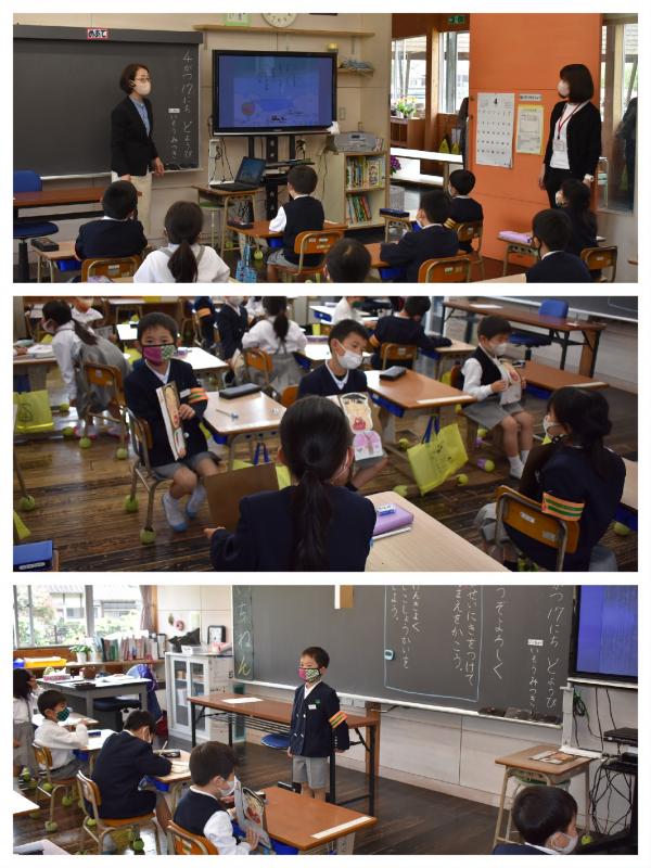 鶴田校長にとって、初めての取組。朝から臨時で来校いただいたICT支援員と入念な打ち合わせを行った後、いよいよスタート。1年生にとっても初めての経験で、テレビ画面に鶴田校長が登場すると、歓声が上がっていました。