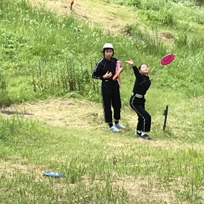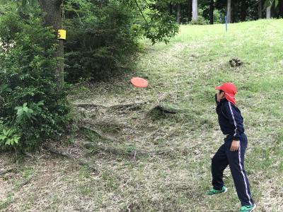 2日目午前中は、フライングディスクゴルフを行いました。フライングディスクをゴールに向かって投げながら、ゴルフのようにコースを回るというゲームです。