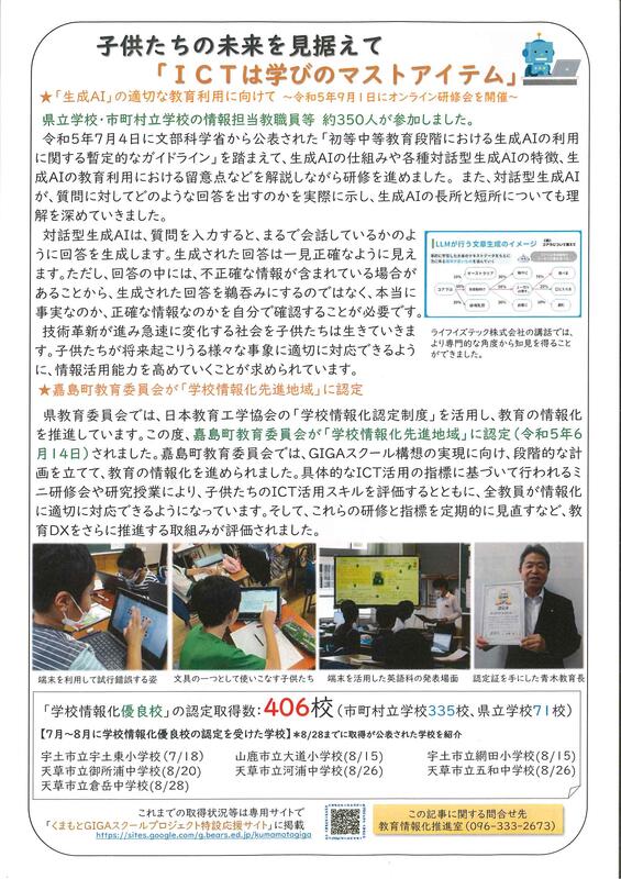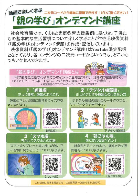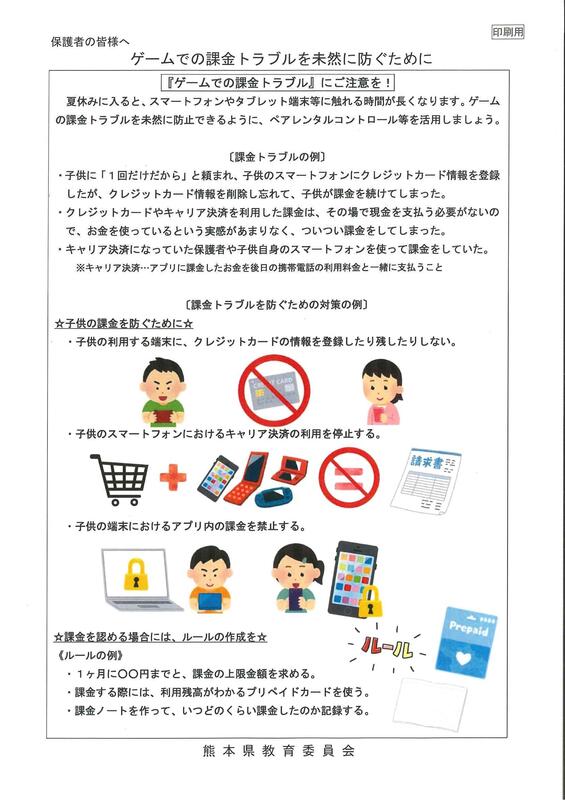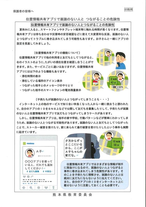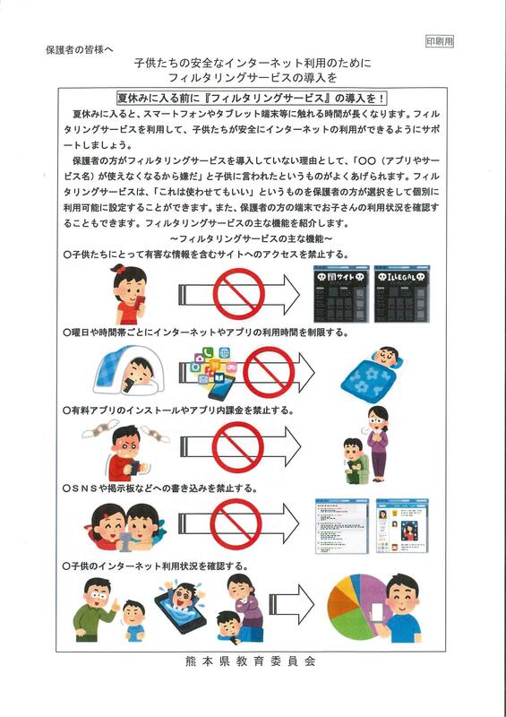 熊本県教育庁より保護者の皆様に向け「情報モラル啓発資料」のご案内が届いています。もうすぐ夏休みというこの時期に、スマートフォン等の端末の安全な使い方を今一度ご確認ください。