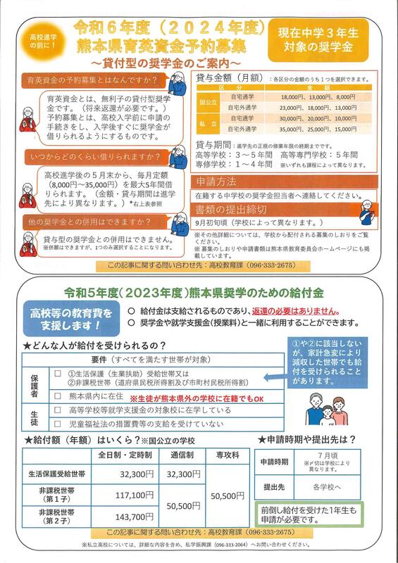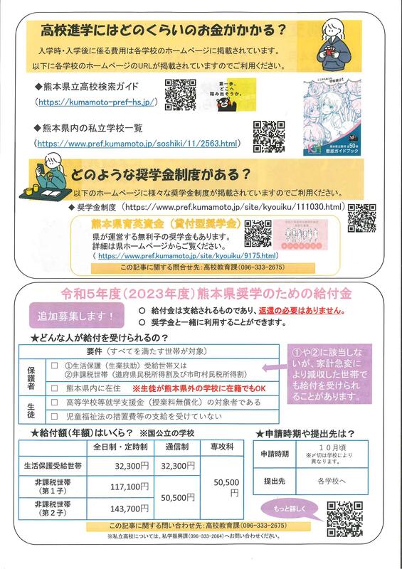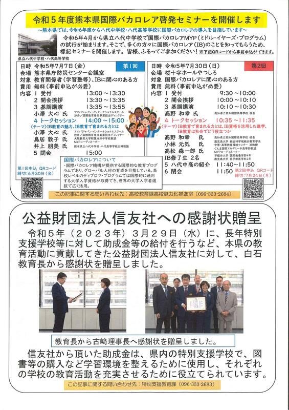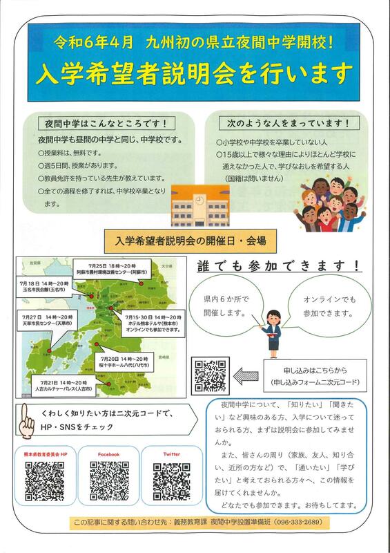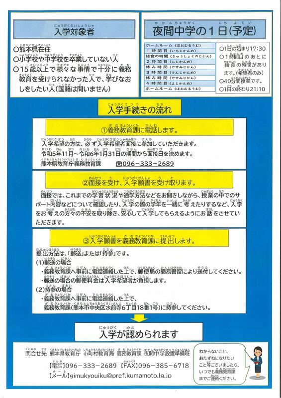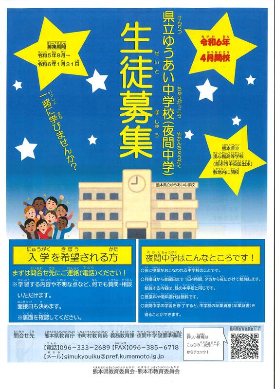 熊本県教育委員会より県立ゆうあい中学校(夜間中学)の令和6年4月開校のお知らせが届きました。