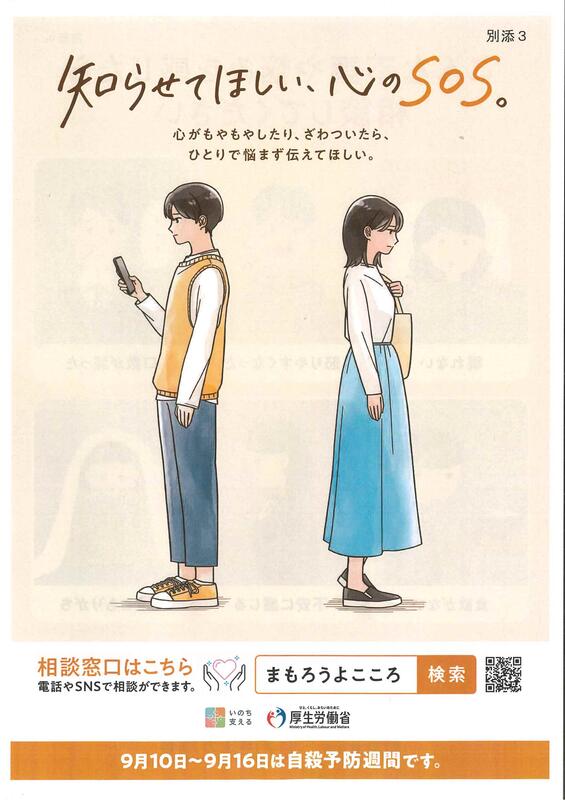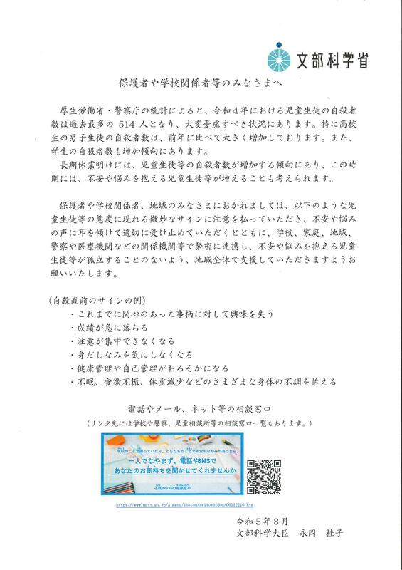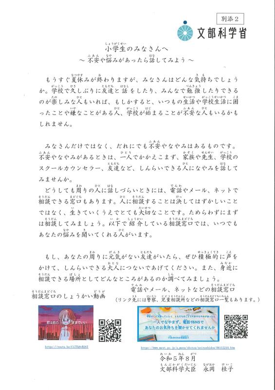 夏休みが終わったこの時期、不安な気持ちを持つ子どもたちも多いのではないかと思います。子どもたち、保護者の皆様に向け、文部科学省から「不安や悩みがあったら話してみよう(相談窓口紹介)」のお知らせが届いています。ぜひご一読ください。