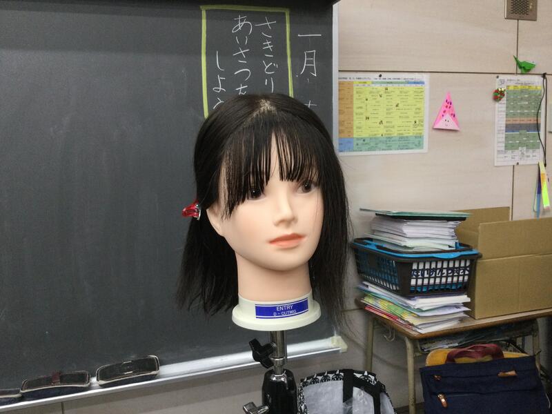 髪の毛クイズをしたり、失敗談や、美容師になってよかったことなどお話を聞いた後は、ちょっと怖いマネキンの首が登場しました。カットの練習台です。これを使って髪の毛を切っていきます。