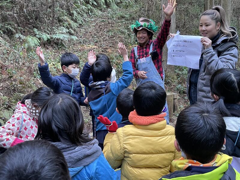 まず、ゆうきの森へ行き、森のお兄さんと野中さんと森を散策しました。そこで、森林についてのクイズをしながら、木や自然への学びを深めました。