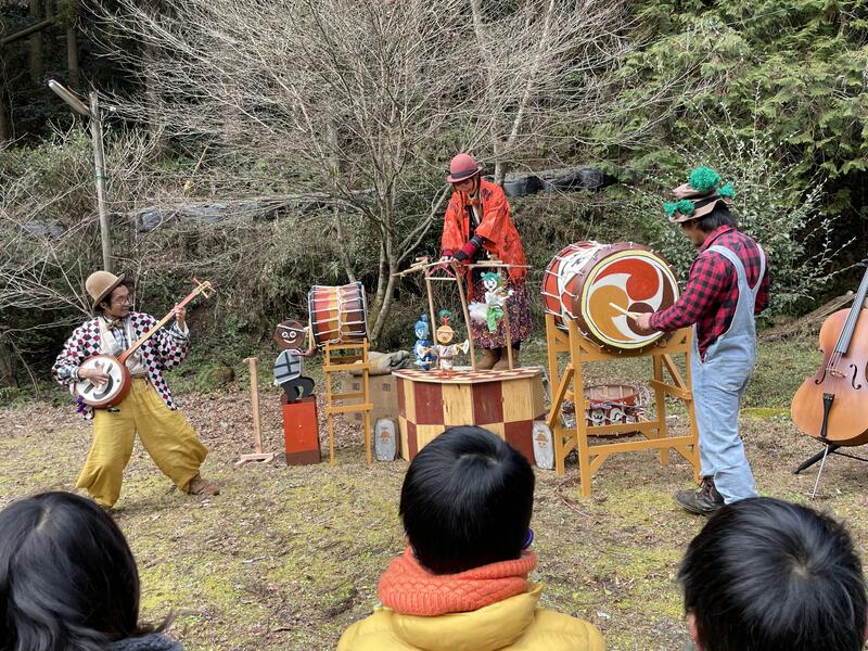 次に、フォレスタジアに移動し、ピエロック一座の人形劇を鑑賞しました。そこで使われている人形や楽器は、ゆうきの森の木からできており、子ども達も木のぬくもりを感じていました。