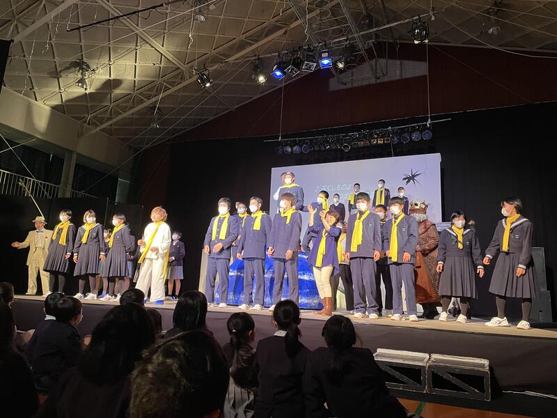 「みんなでつくり上げる演劇を」と劇団の方が声をかけてくださり、6年生と中2,本校の鶴田校長と内古閑教頭、鹿北中学校の西浦教頭先生も出演者の一人として参加し、舞台にあがりました。