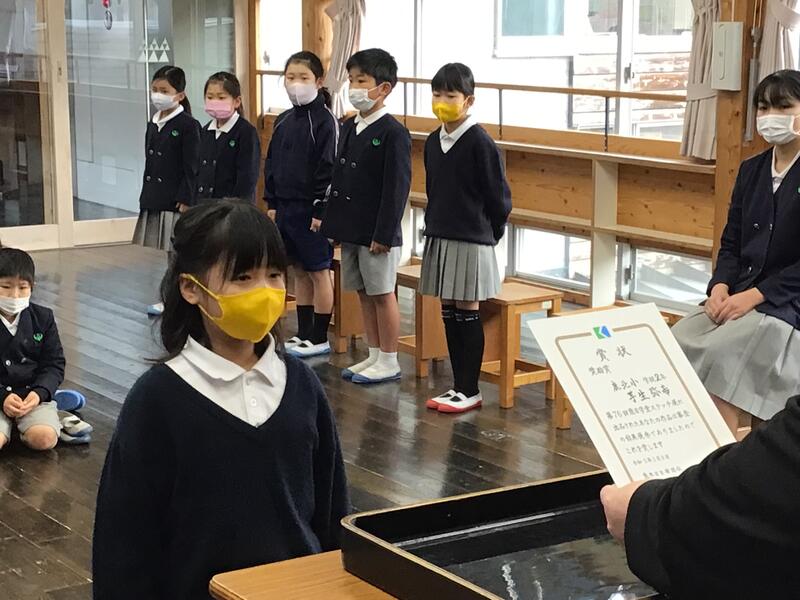 校長先生の話の前に、「県文集『ゆめ』」の特選と奨励賞、「県の読書感想画コンクール」入選の表彰を行いました。表彰を受けた子どもたちは、集会終了後校長先生より、その立派な態度と日頃の努力の様子に対して、とても褒められました。
