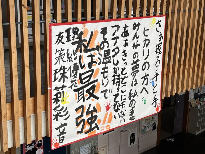 さて、児童玄関を見ていただけたでしょうか。書道クラブの子どもたちによる「私は最強」。気持ちの伝わる素敵な習字が掲示されています。