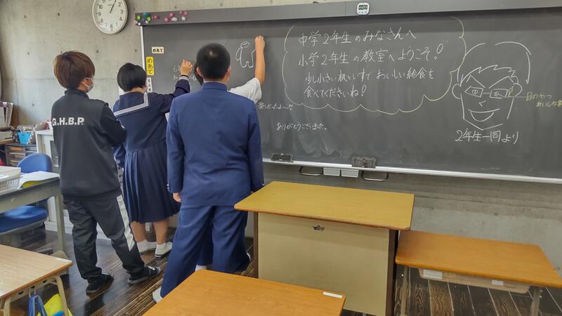 今日も小学生と中学生が教室を交替しての給食でした。上の写真は5年生の児童が給食を食べにやってくる中学2年生に書いたメッセージです。5年教室を通りかかったときに見つけ、嬉しくなって写真を撮りました。中学生も喜んで返事を書いていました。心も温まる給食時間になりました。