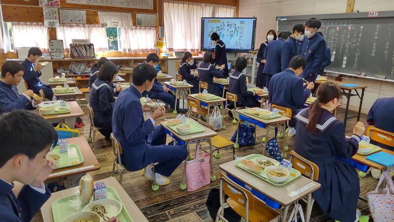 写真を撮っていると「親が欲しくなる写真ですよね」と先生が。今日は脚が全く入らなくなった小学1年生の机で中学3年生が食べました。前に立っているのはおかわりに並んでいる生徒です。すっかり成長した姿で、かわいらしい掲示物を見ながらニコニコ笑顔で食べていました。