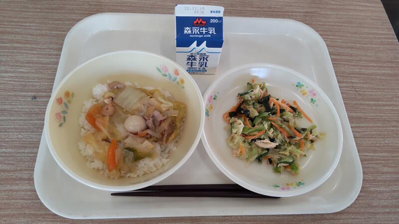 寒くなると冷めないように料理にとろみをつけることが増えるのではないでしょうか?今日は中華丼にしっかりとろみをつけました。さすがは調理員さん、大釜でも均一にツヤと透明感のあるとろみがついていました。上手にとろみをつけるコツは、①具材の水分でゆるくならないようにしっかり加熱してからとろみをつける②ゆっくり丁寧に絶えず混ぜる③とろみをつけたら時間をかけすぎないことです。上手くいかないときは試してみてください。