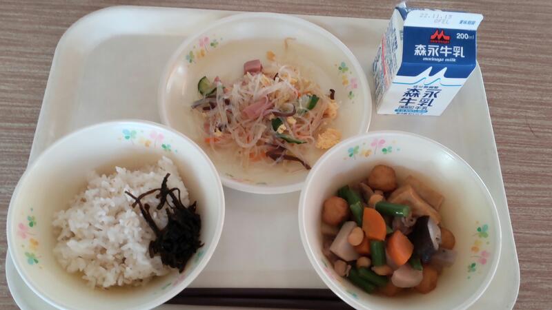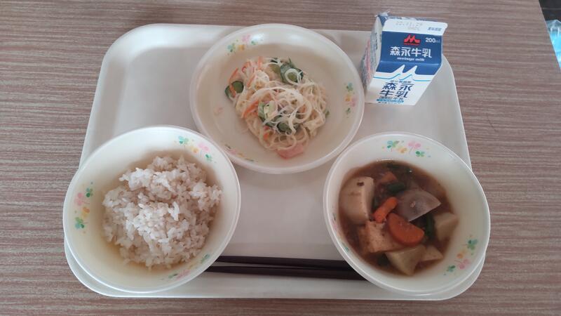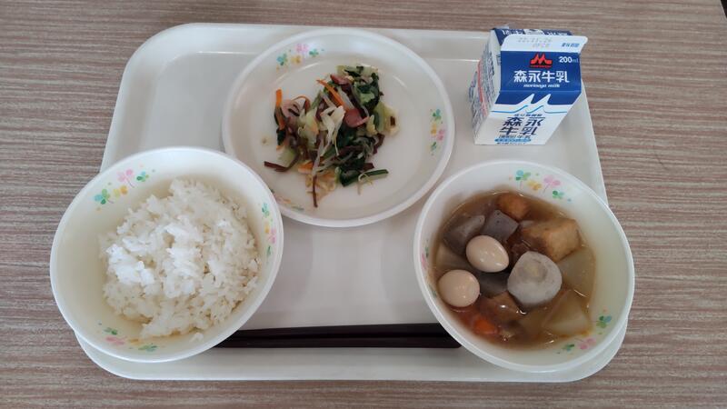 「給食でおすすめの料理はなんですか?」とよく聞かれます。好みはありますが、私は「煮物です」と答えることが多いです。大量の食材からそれぞれのうま味が出て、おいしくなるのではないか思います。今日も丁度よい硬さで煮崩れることなく、味も均一についていました。子どもには佃煮昆布も人気があります。根菜のおいしい季節になりました。肉や芋の種類をかえたり、ひじき、レンコン、大豆、茎わかめ、春雨など具材を換えて、いろいろな煮物をつくってみてはいかがでしょうか。